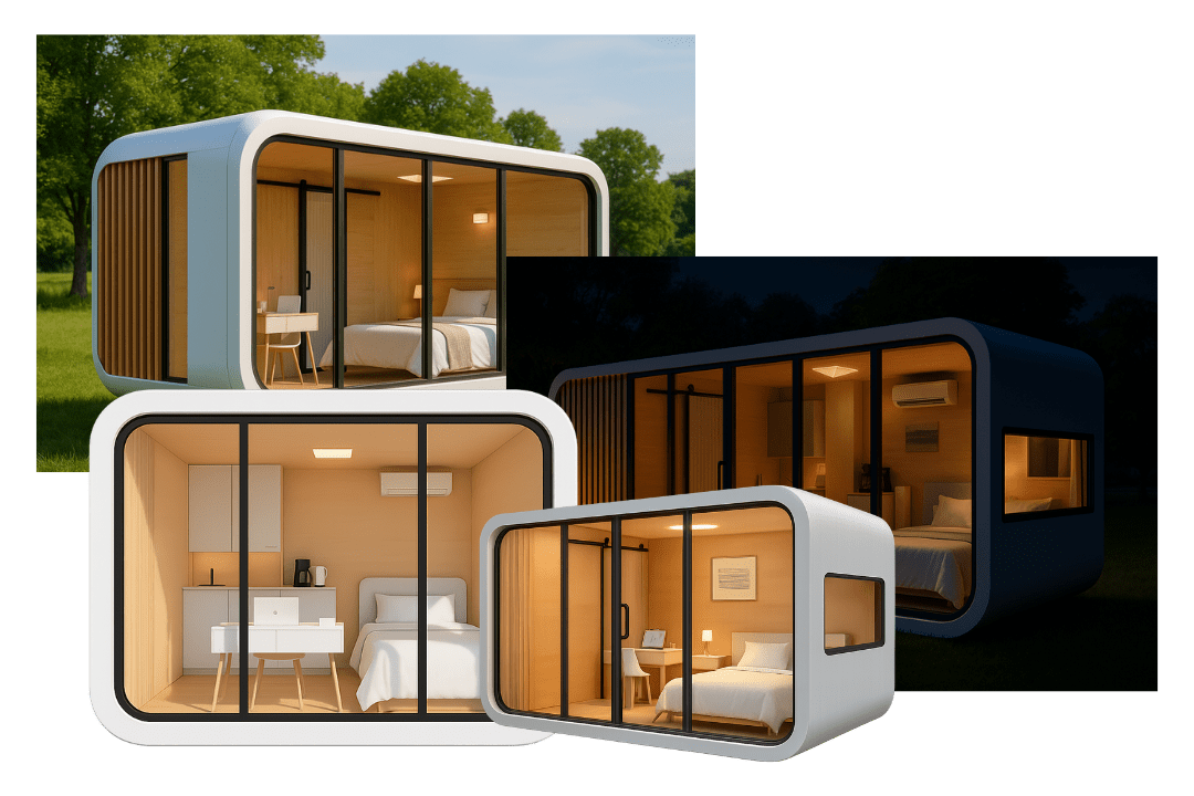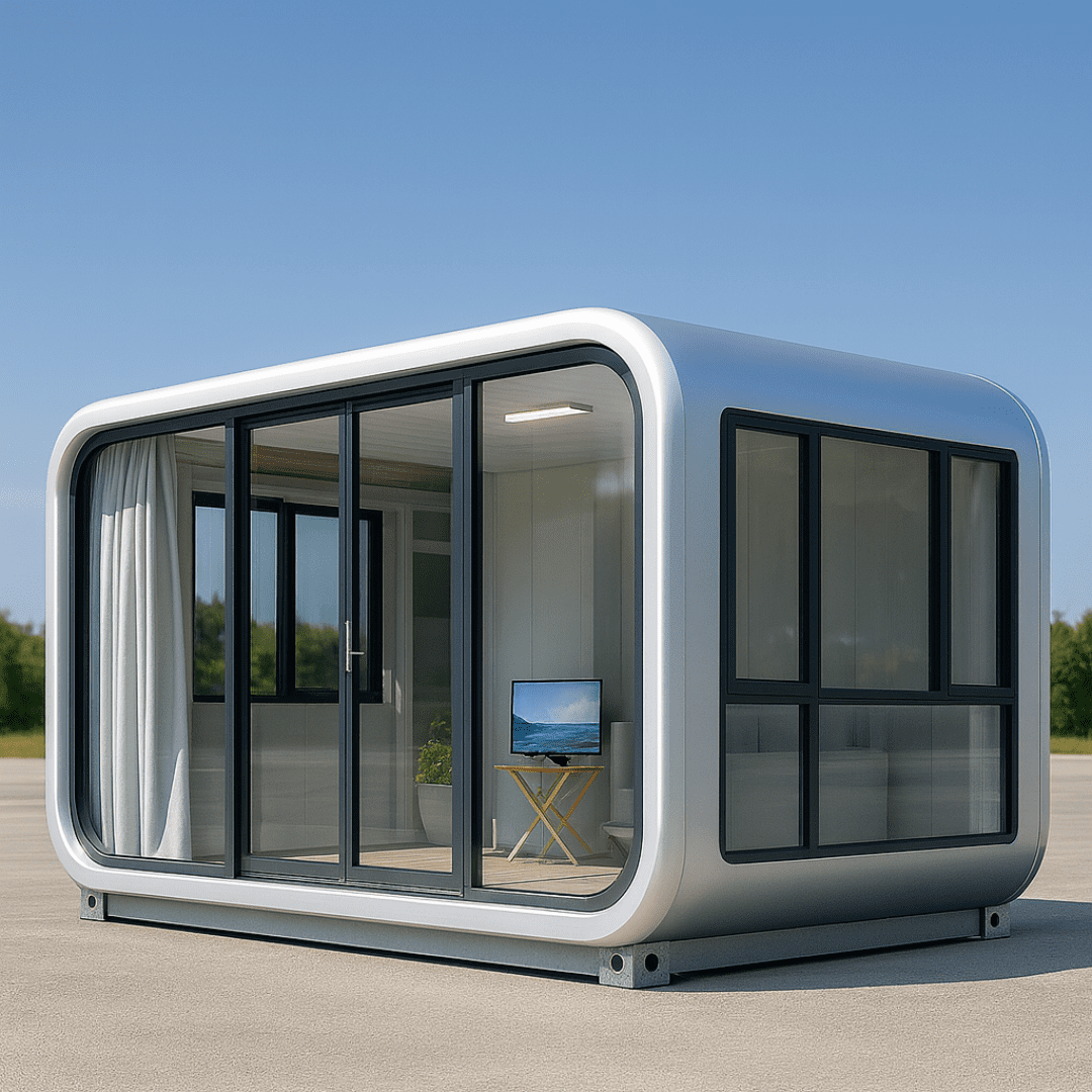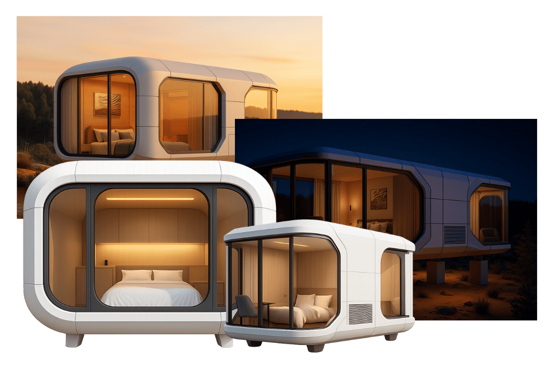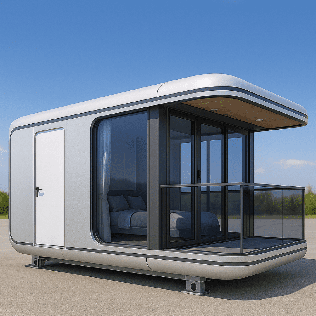 High tech luxury capsule with panoramic glass and long lifespan materials. Designed for resorts, glamping, and premium stays.